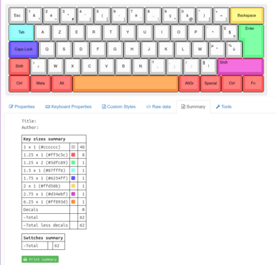 <p style="clear: both;" /><p style="clear: both;" />Ce sommaire indique la '''taille indicative de chaque type de touche''' ainsi que '''le nombre de touches associées''' à chacune d’elles. Le "coloriage" est utile pour voir visuellement quelle touche correspond à quelle taille.<p style="clear: both;" />On peut également sauvegarder notre configuration en exportant sous format "json". Via ce format on peut utiliser une extension de kicad qui se prénomme "'''Keyboard footprints placer'''" et qui permet de placer automatiquement les boutons si on les intancie dans le bon ordre (exemple : bouton 1 => SW1 , etc...). L'outil est un peu capricieux mais fais gagner un peu de temps précieux sur le routage. | |||